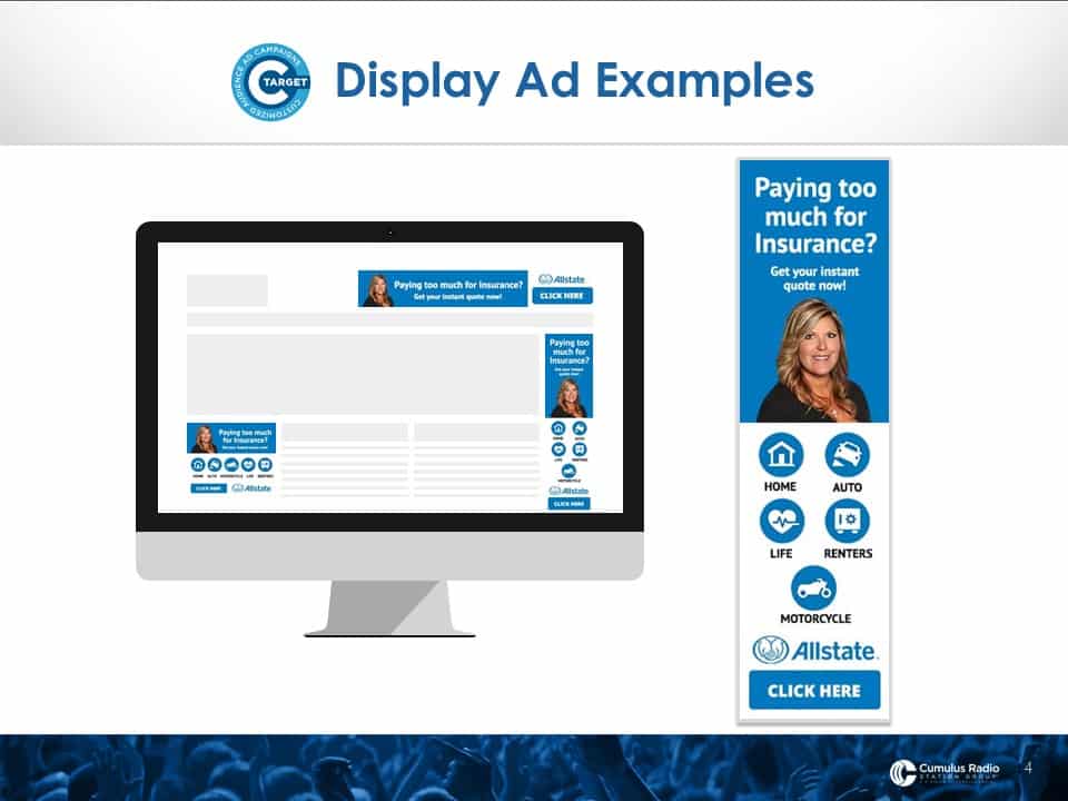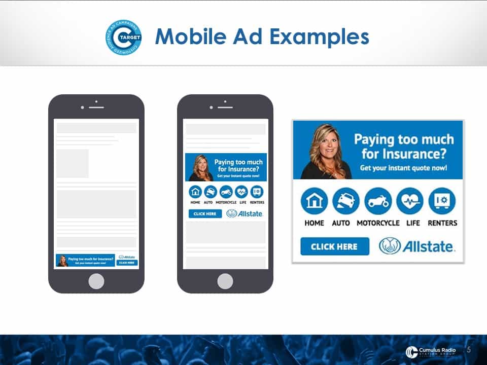 There are four different banner ad or digital display ad sizes. As you navigate websites, you see different ads pop up all the time. These are native ads in the website and that’s where we display YOUR MESSAGE to your targets. The image above shows you how they typically look on a computer or laptop. The image below shows you what they look like on a smart phone.