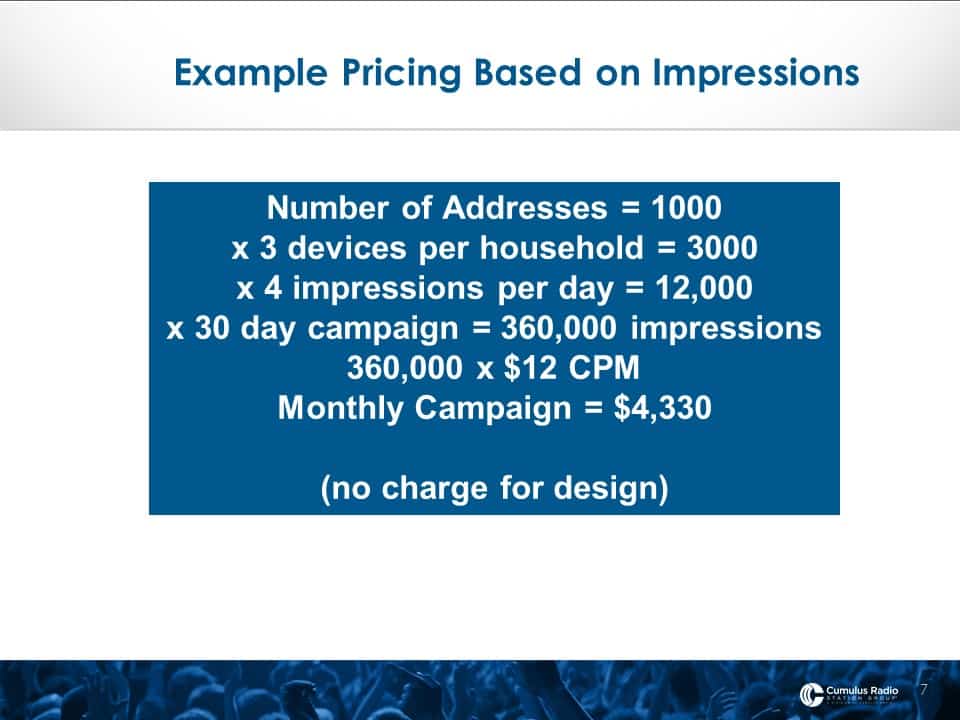 You would need a total 360,000 impressions to effectively serve 1,000 ADDRESSES (not people!) 4 banner ads a day for 30 days. Consistency is the third key to successful advertising and seeing your ad consistently and frequently over the next 30 days will increase your brand awareness and keep your business name TOP OF MIND!